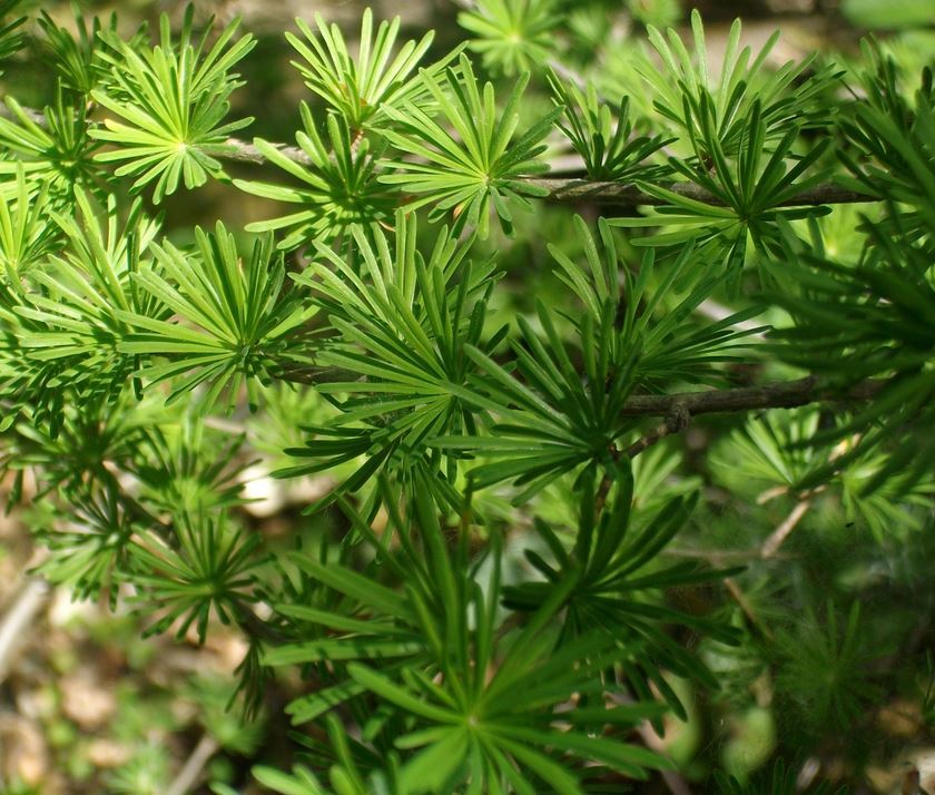 Japanlerk (Larix kaempferi) blomstrer i mai-juni. Utpå høsten får treet en gyllen farge, før nålene faller av.